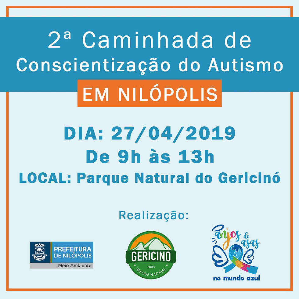 Com o objetivo de ajudar a conscientizar a população sobre o Autismo, um transtorno no desenvolvimento do cérebro que afeta cerca de 70 milhões de pessoas em todo o mundo e 2 milhões de pessoas no Brasil, a Prefeitura de Nilópolis, por meio da Secretaria Municipal de Meio Ambiente, realizará a 2ª caminhada alusiva ao tema neste sábado (27). O evento pretende não só informar a população a respeito da síndrome, mas chamar a atenção para a importante luta pela conscientização do autismo. Para participar basta comparecer ao Parque Municipal Natural do Gericinó, a partir das 9h, onde além da caminhada também estão previstas diversas atividades e serviços referentes ao tema. O Parque Municipal Natural do Gericinó fica na Rua Antônio João de Mendonça, s/nº, bairro Manoel Reis. Serviço Evento: 2ª Caminhada pela Conscientização do Autismo Data e Horário: 27 de abril de 2019 - 9h Local: Parque Municipal Natural do Gericinó Endereço: Rua Antônio João de Mendonça, s/nº, bairro Manoel Reis. Como chegar: O ônibus da linha 002 (Manoel Reis x Rodoviária) é a melhor opção. De carro basta acessar a Rua Alberto Teixeira da Cunha e seguir até o seu final, onde fica a entrada do estacionamento no Parque.