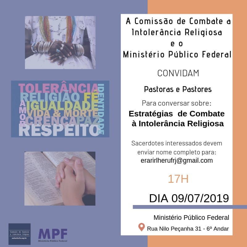 A Comissão de Combate à Intolerância Religiosa(CCIR) e o Ministério Público Federal, convidam Pastores e Pastoras de Igrejas evangélicas para participarem de um encontro no dia 9 de julho, às 17h. Pauta: Estratégias de Combate à Intolerância Religiosa. Os interessados precisam enviar o nome completo para o email erarirlherufrj@gmail.com Endereço: Rua Nilo Peçanha 31- 6° andar- Rio de Janeiro (RJ)